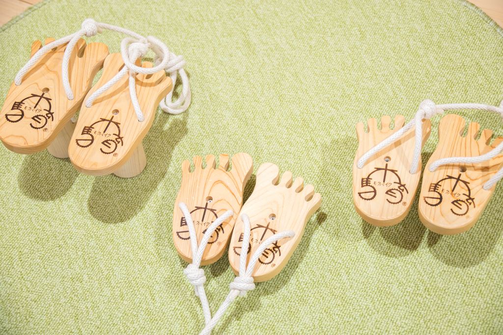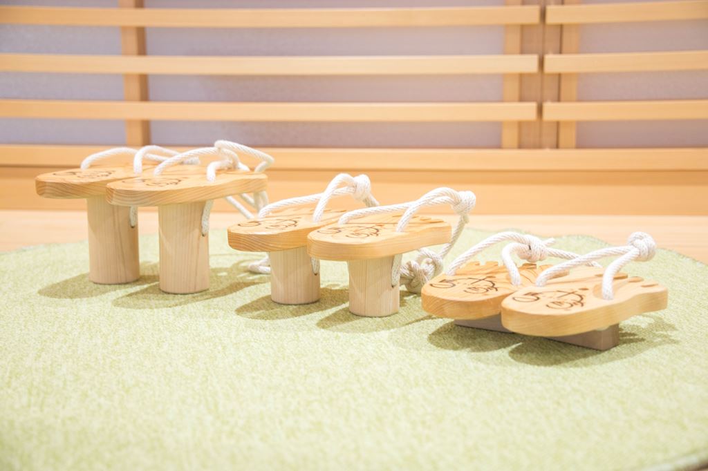 缶ぽっくりを連想するおもちゃです。 素足で乗って両手でヒモを握り、左右の足を交互に引っ張り上げて歩きます。 足の裏から木の感触を味わいましょう。