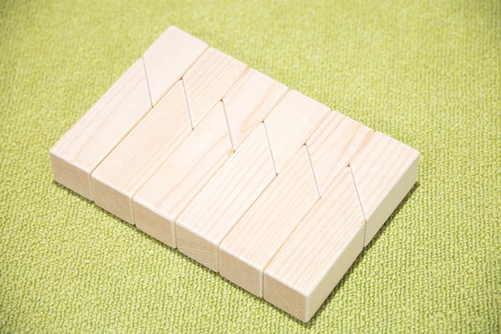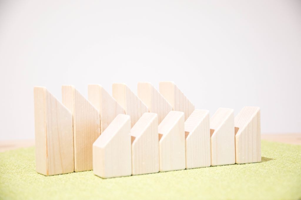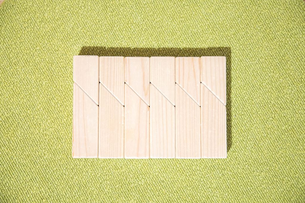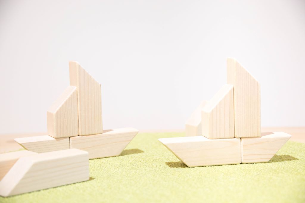 この大小2種類のこの積木は斜面を下に積むと船に なり、ロケットや動物のような尖ったカタチも創り あげることが出来ます。 シンプルな積木ほど造形の自由度は高く、世代を 超えて使い続けることが出来ます。